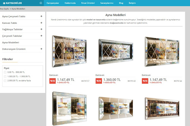 Siteye girdiğinizde lütfen blog kısmında ki gerek dekorasyon, gerekse ressamlarla ilgili bilgilere göz atın. Nasıl emek harcamışlar bizlere yaptıkları işin ciddiyetini anlatabilmek için. Ayna galerisine baktığımda; daha önce birçok dekorasyon mağazasında gezmeme rağmen görmediğim ve hayranlıkla bakakaldığım ince bir işçiliğin hüküm sürdüğü aynalarla karşılaşmak beni ziyadesiyle mutlu etti. Fiyat kısmındaki aralıktan bütçenize uygun olanı seçebilmenize de olanak sunuyor site.